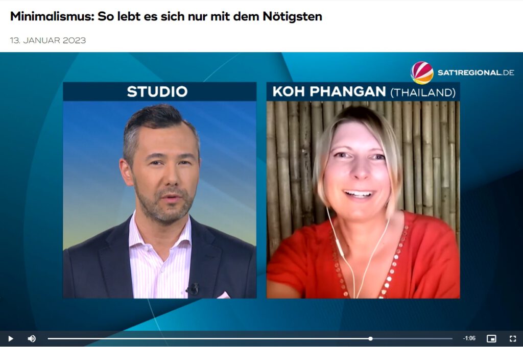 Ich durfte SAT.1 am 13.01.2023 ein kurzes Interview zu meinem Leben als Minimalistin geben – live aus Thailand. Eine besondere Freude: Professor Jürgen Manemann vom Forschungsinstitut für Philosophie Hannover ist auch bei dem Bericht dabei.